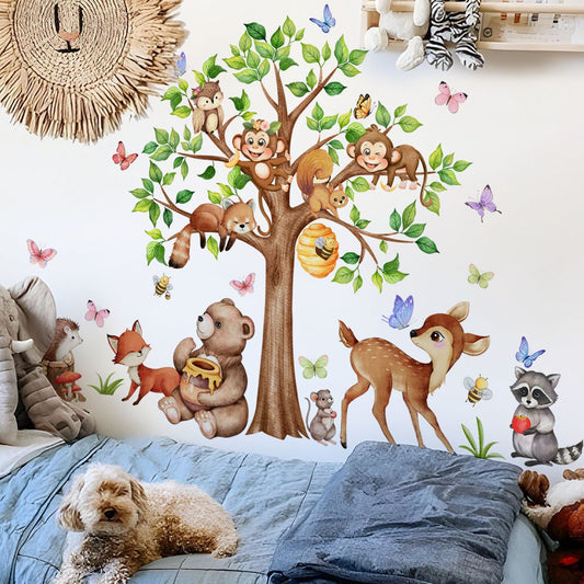 COVPAW Wall Stickers Zoo Big tree Monkey Deer Bear Bees Fox Owl Hedgehog Forest Animals Children's Gift Home Decor Living Room Bedroom Children's Room Decoration Mural Wall Picture Self Adhesive, Removable and Waterproof