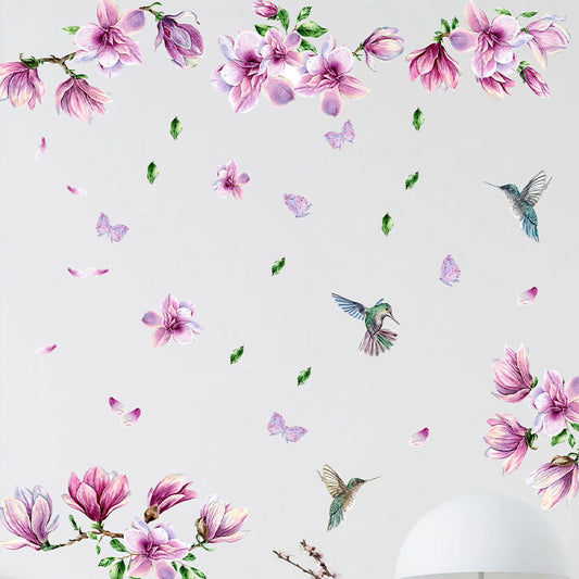 COVPAW Wall Stickers Magnolia Blossoms Flower Vine Birds Mural Wall Painting Nature Home Office Decor Living Room Bedroom Children's Room Decoration Self Adhesive, Removable and Waterproof