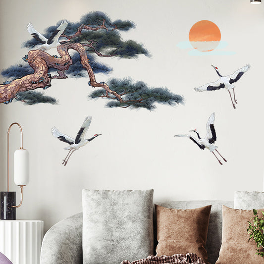COVPAW Wall Stickers Crane and Pine Tree Sun Chinese Style Mural Wall Painting Home Office Wall Decor Living Room Bedroom Children's Room Decoration Halloween Self Adhesive