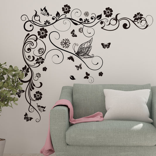 COVPAW Wall Stickers Black Flower Vine Butterfly Nature Home Office Decor Living Room Bedroom Children's Room Decoration Self Adhesive, Removable and Waterproof