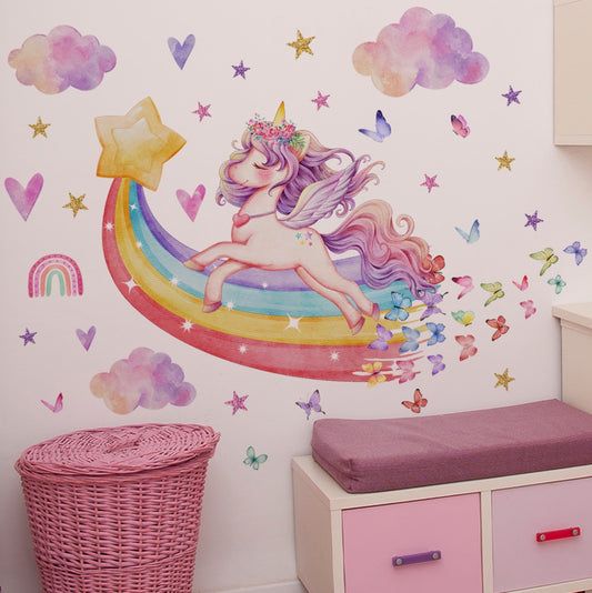 COVPAW Wall Stickers Unicorn Rainbow Butterflies Heart Cloud Kids Nursery Baby Children's Room Bedroom Deco Boy Girl, Mural Wall Paintings