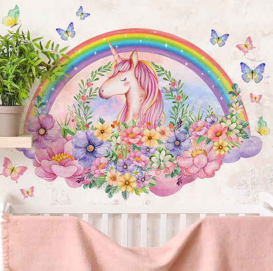 COVPAW Wall Stickers Unicorn Rainbow Butterflies FLowers Kids Nursery Baby Children's Room Bedroom Deco Boy Girl, Mural Wall Paintings